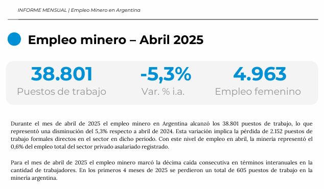 Según la Dirección Nacional de Promoción y Economía Minera la minería representa el 0,6% del empleo privado registrado en Argentina y está en retroceso.