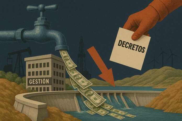 El decreto 564/2025 establece una doble privatización. Por un lado se concesionará a empresas privadas la operación técnica de las represas, la generación de energía eléctrica, su comercialización y la regulación de los caudales, como sucede desde hace 30 años. Y por otro lado, el control societario también será ofrecido en un concurso público nacional e internacional sin un precio mínimo de venta puesto por el Estado. Esta doble desposesión afecta al derecho de explotación del agua del Limay y Neuquén, y también a la soberanía jurídica que mantenía la titularidad de los activos en el Estado.
