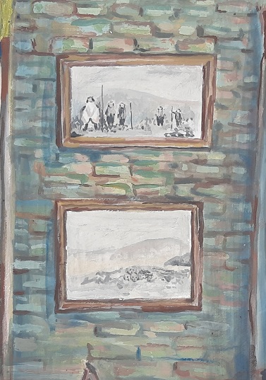 En la pintura, que recrea muy libremente la habitación de la foto, las únicas figuras humanas que aparecen son las que apenas se ven en las fotos reproducidas en el centro. Esas fotos también corresponden al álbum de Encina y Moreno, y fueron reproducidas en los libros que mencionamos. En ellas se retrata la profanación de un cementerio indígena. En la primera, la de arriba, son probablemente algunos integrantes de un grupo encabezado por el cacique Millamain quienes están por empezar a desenterrar. En la segunda (reproducida por Francisco debajo de la primera) se pueden ver varios cráneos humanos apilados entre la tierra removida.