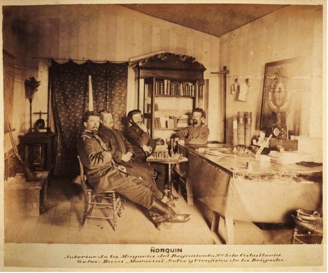 La pintura que analicé en la primera parte de este trabajo surgió de una de las fotos (“Interior de la Mayoría del regimiento número 3 de caballería. Jefes: Daza, Morosini, Solís y Cirujano de la Brigada”) incluidas en un álbum titulado Vistas fotográficas del Territorio Nacional del Limay y Neuquén, publicado por Encina, Moreno y Cía. Francisco conoció esas imágenes por el libro Indios y soldados de Julio Vezub, publicado en 2002 por la editorial El Elefante Blanco (más tarde esas mismas imágenes fueron recopiladas en el libro Patrimonios Visuales Patagónicos, compilado por María Inés Rodríguez Aguilar y Julio Vezub, y publicado por el Museo Roca en 2017, de su versión digital tomamos las fotos que se pueden ver acá).